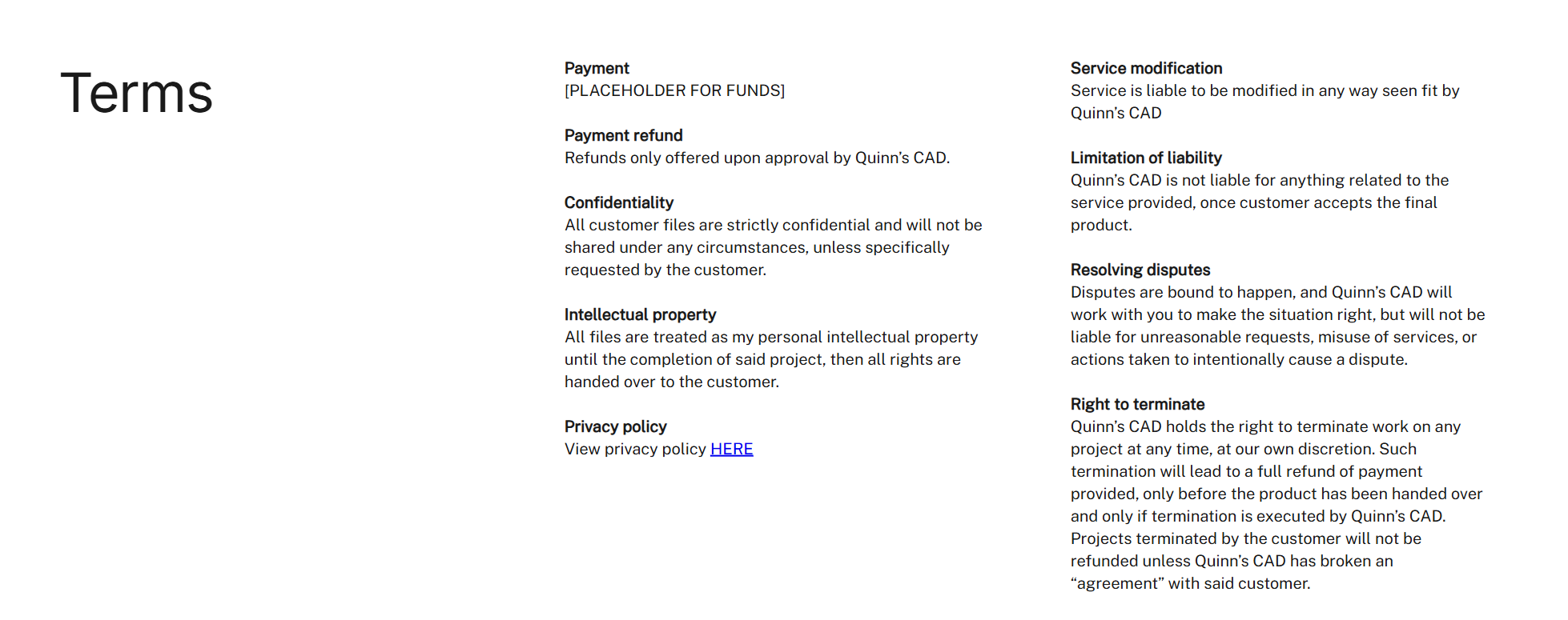 Image showing terms and conditions text from "Quinn's CAD." Topics covered include payment, refund policy, confidentiality, intellectual property, privacy policy, service modification, limitation of liability, resolving disputes, and right to terminate services.
